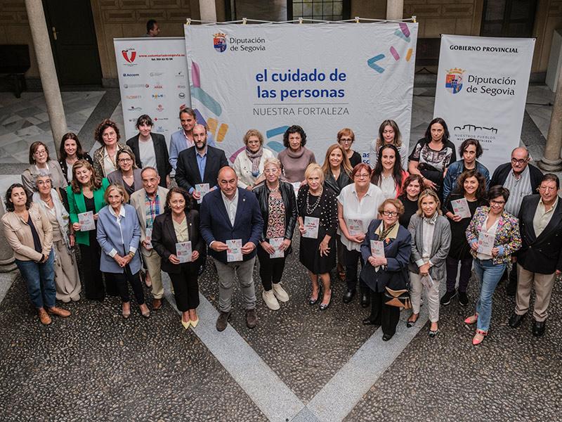 La Diputación de Segovia ha dado la mano a la Plataforma del Voluntariado para editar una guía que reúne veintisiete colectivos, entidades y asociaciones de carácter social, que desarrollan su labor a lo largo y ancho del territorio provincial. Un documento que se ha presentado en el patio de columnas del Palacio Provincial, con la presencia del presidente de la Diputación -que tiene además reservadas las competencias de Asuntos Sociales-, Miguel Ángel de Vicente. Ha estado acompañado por la secretaria general de la Plataforma del Voluntariado de España (PVE), Pilar Pineda, y por representantes de las diferentes asociaciones de la red de la Plataforma del Voluntariado de Segovia, encabezados por su presidenta, Nélida Cano.