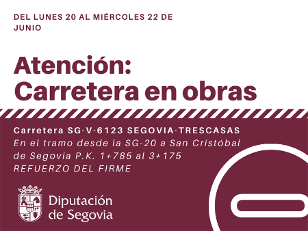 El Área de Acción Territorial de la Diputación continúa haciendo frente a su planificación de 2022 y durante los días 20, 21 y 22 de junio procederá al refuerzo del firme de la carretera provincial SG-V-6123, en el tramo entre la SG-20 y San Cristóbal de Segovia y los puntos kilométricos 1+785 y 3+175.